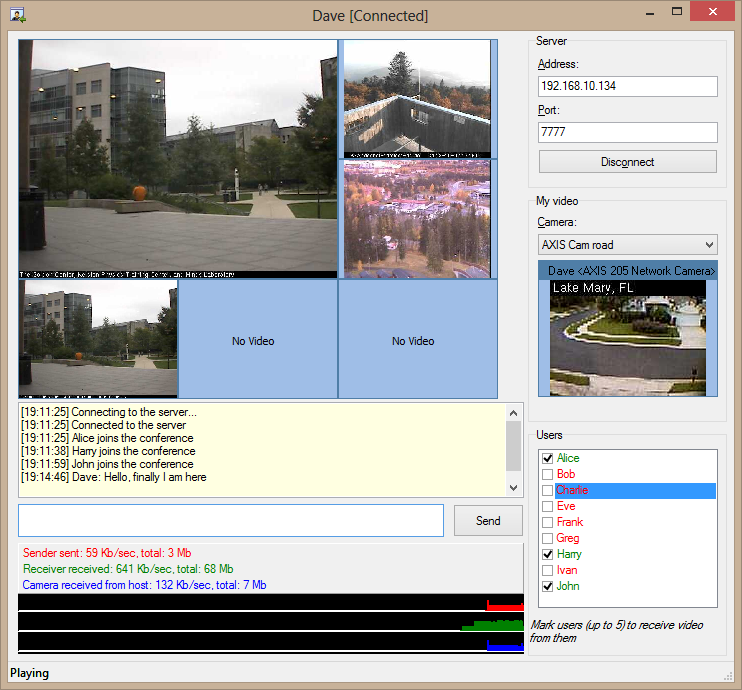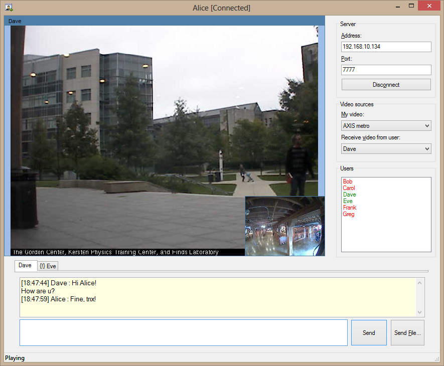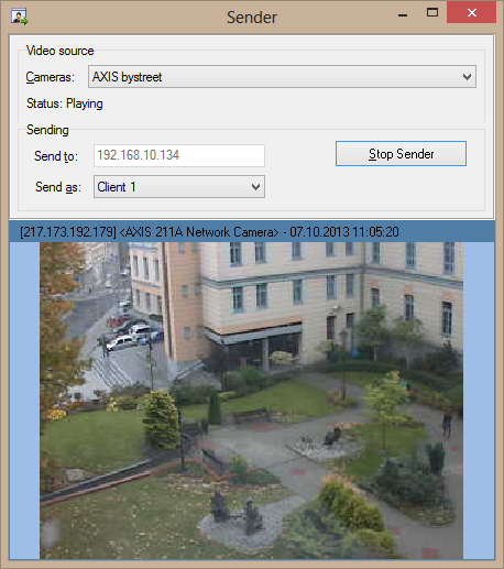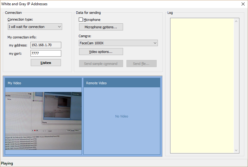 Видео будет передаваться по сети и приниматься этим же приложением. Полученное видео будет проигрываться на правой панели.
