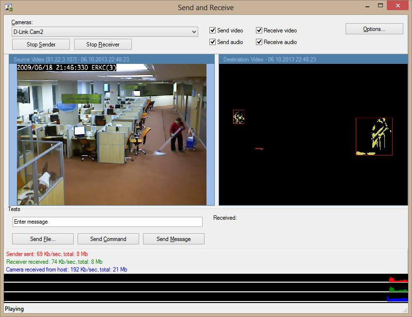 Помимо видео, приложение пересылает звук с микрофона. Также оно может посылать текст, файл и тестовую команду.