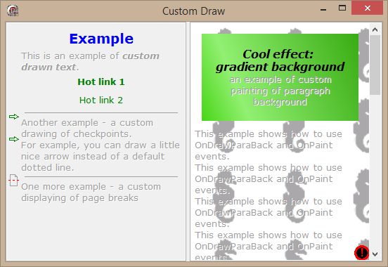 На рисунке справа изображён специальный дополнительный тип элемента документа TRichView — TRVBlendBitmapInfo, показывающий рисунки с заданной степенью прозрачности.