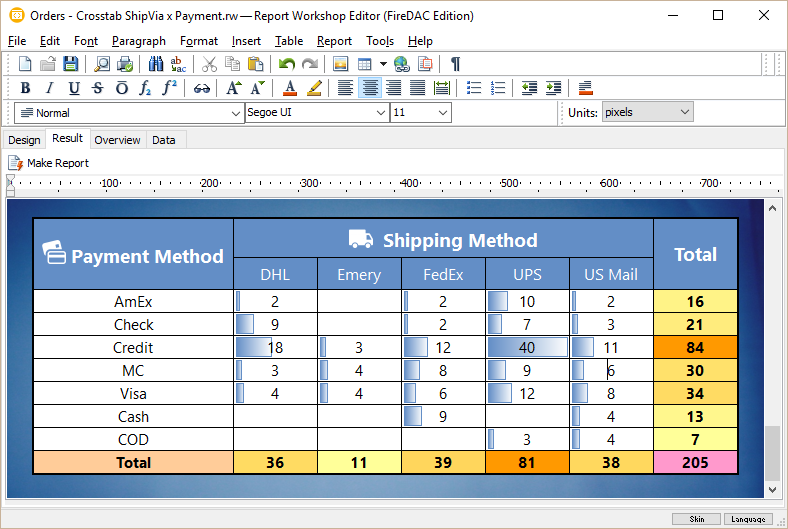 - каждая ячейка может содержать не просто значение, а произвольный текст и рисунки; даже вложенные отчёты