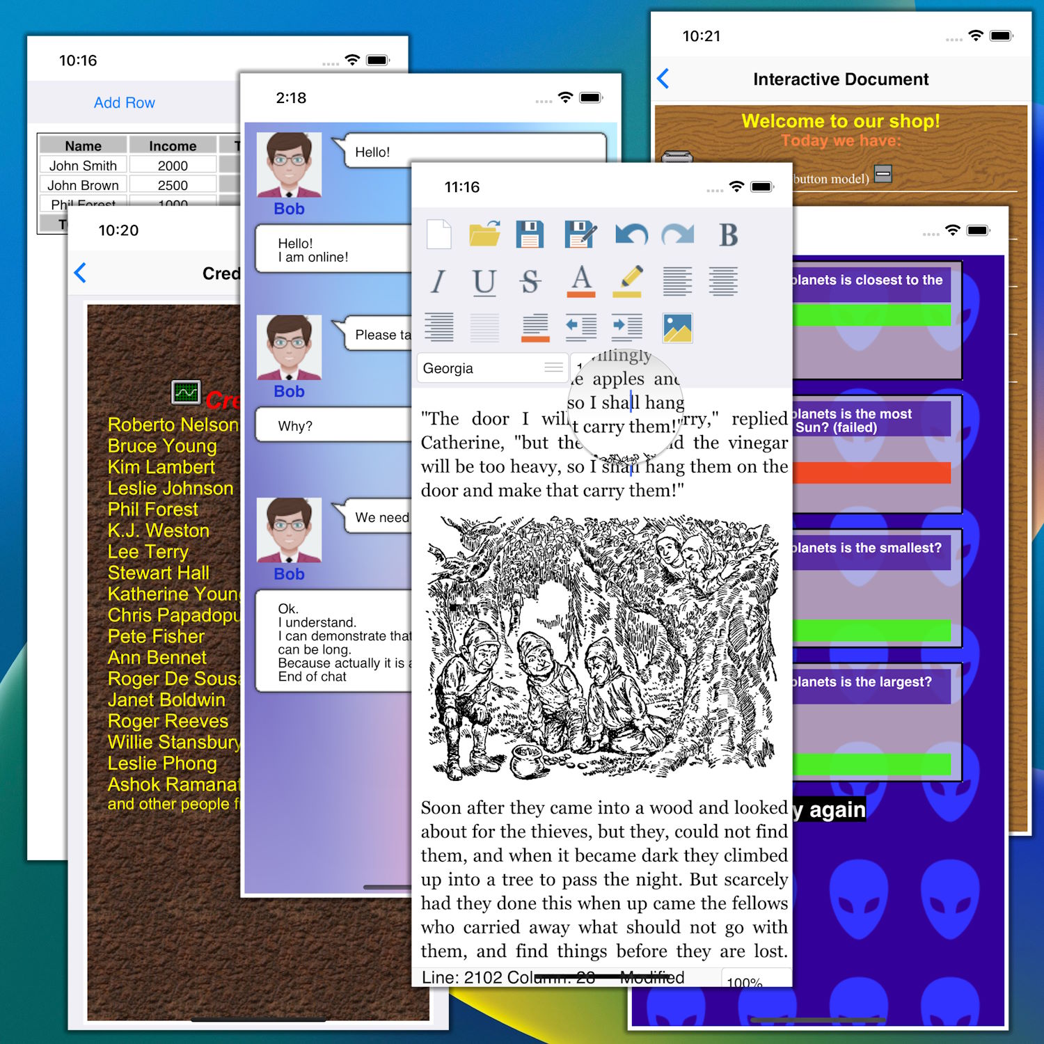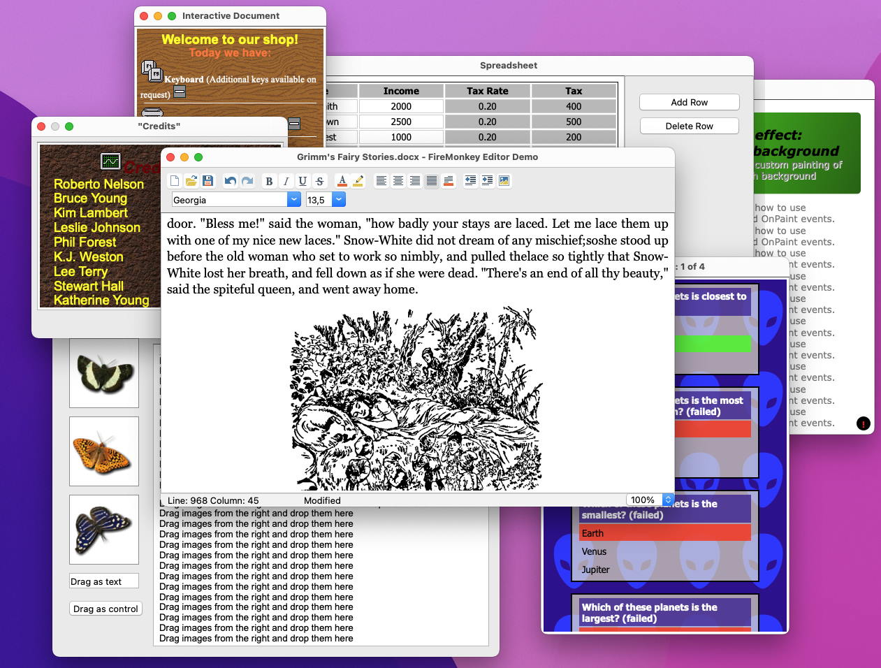 Компоненты поддерживают различные атрибуты оформления текста (шрифты, верхние и нижние индексы, цвет текста и фона, возможности нестандартной прорисовки). Документы могут включать таблицы, рисунки (в том числе и из imagelist), анимации, любые визуальные компоненты Delphi. Выравнивание абзацев по левому краю, правому краю, центру, обоим краям, настраиваемые поля и отступы, многоуровневые списки абзацев (bullets & numbering), Юникод (даже в старых версиях Delphi), фоновые изображения, печать с предварительным просмотром, импорт и экспорт HTML, RTF, DocX, Markdown, работа с базами данных и многое другое...