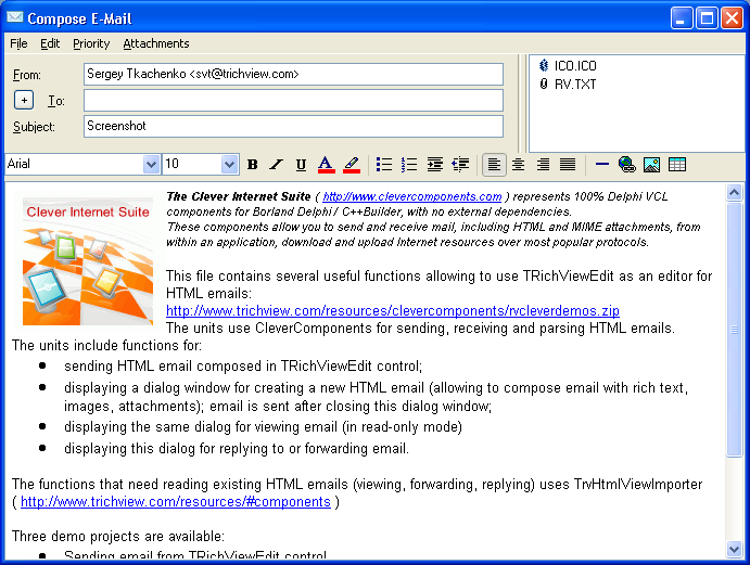 - отсылки сообщения электронной почты, созданного в компоненте TRichViewEdit;