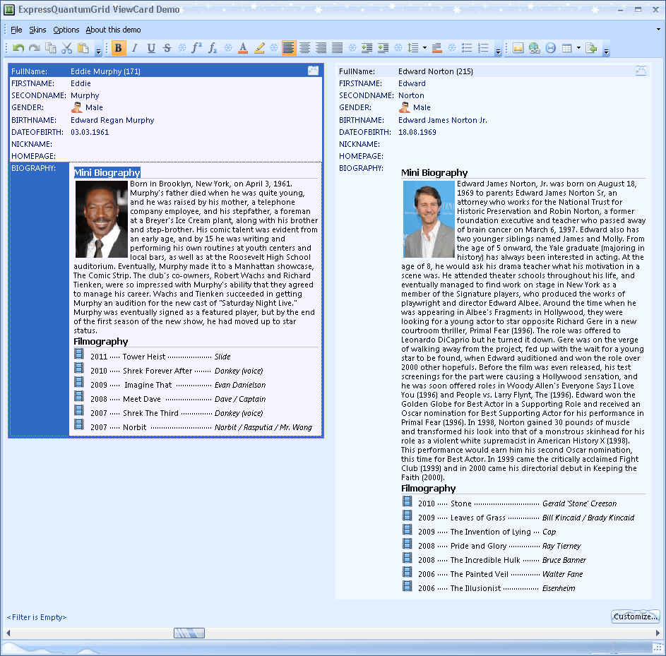 Пакет включает в себя редакторы форматированного текста, работающие и как отдельные компоненты, и как редакторы содержимого QuantumGrid. Редакторы поддерживают ExpressSkins™ и ExpressSpellChecker™.