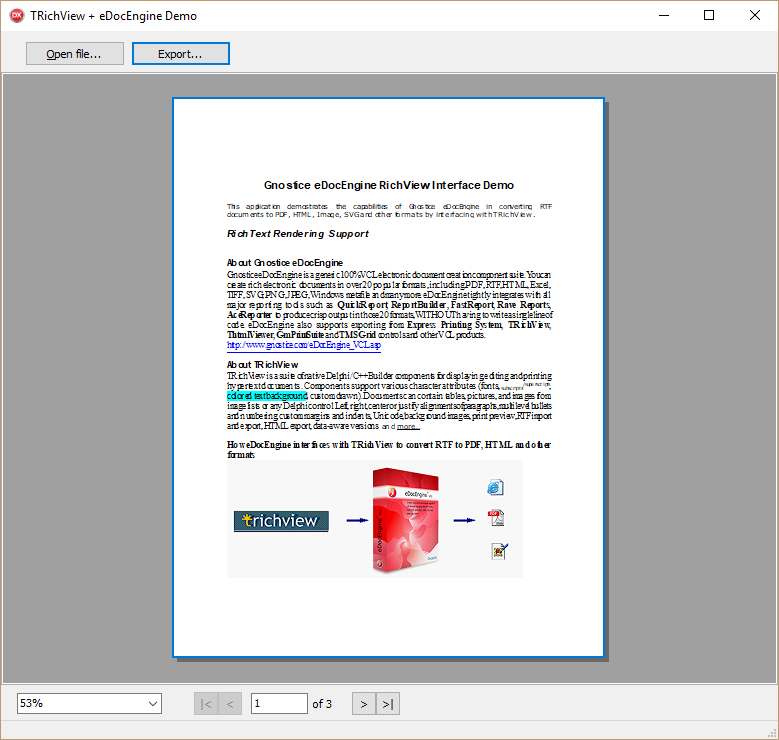Gnostice eDocEngine экспортирует документы TRichView в PDF, XHTML, Excel, Quattro Pro, Lotus 1-2-3, DIF, SYLK, SVG (векторная графика в формате XML), TIFF, PNG, JPEG, GIF, BMP, EMF, WMF, RTF, HTML и другие форматы.